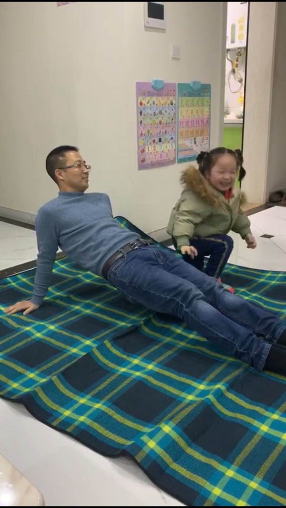爸爸妈妈和孩子玩游戏的时候,把自己也变成了孩子。锻炼肺活量的桌上足球、提高反应能力的小脚踩大脚、拉伸肌肉的两人拔河、增强平衡能力的对对碰、比拼智力的棋类游戏跳井,全身心投入,玩得不亦乐乎!