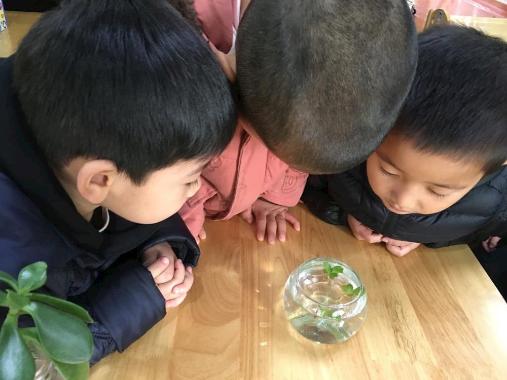 探索鱼植共生时,活泼的小鱼、生机的植物来到了我们的水管中,小鱼喜欢吃什么植物的根?小鱼和植物怎样才能共生?它们是用什么喝水的?哪种植物更喜欢喝水?如何设计流动的水?我们自制了滴水装置,矿泉水瓶倒置架空、冰棒棍架空、尝试水管搭建架子,共同探寻鱼植共生的方法。