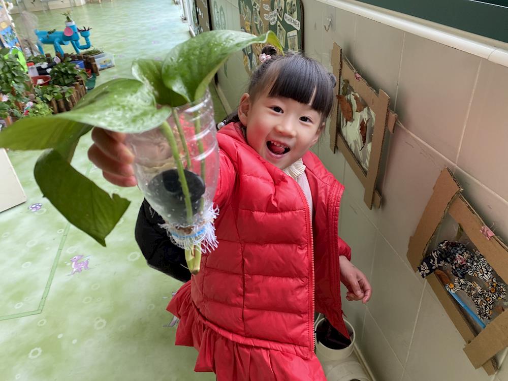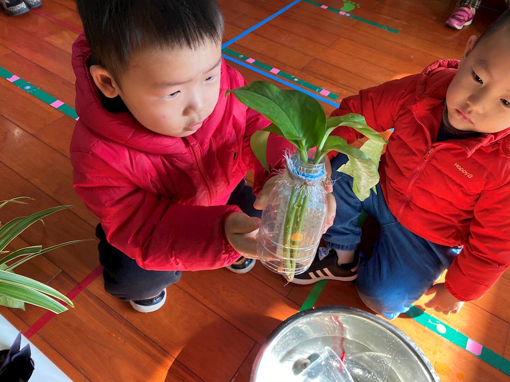 在照料自然角的时候,晨鑫看到绿萝和吊兰在盆里东倒西歪的,给他们扶起来后又会自己倒下了。植物乱乱得,我们要怎么帮助它们呢?关于这个问题,我们展开了一段水盆植物装修记的探索。通过几轮的尝试,我们一起明确了植物需要住在高高的、重一点的,有小小的洞的家里,搭建植物的家要用到平整的砖块。