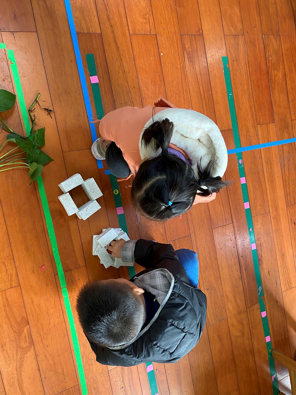 孩子们经过多种搭建、比较尝试,最终选出了两种方案能够让植物站起来,一种是方形的,一种是圆形的,通过就近观察、摇晃对比两种方式的稳固程度,最终投票得出圆形洞口的更稳固一些,更适合给植物造家。