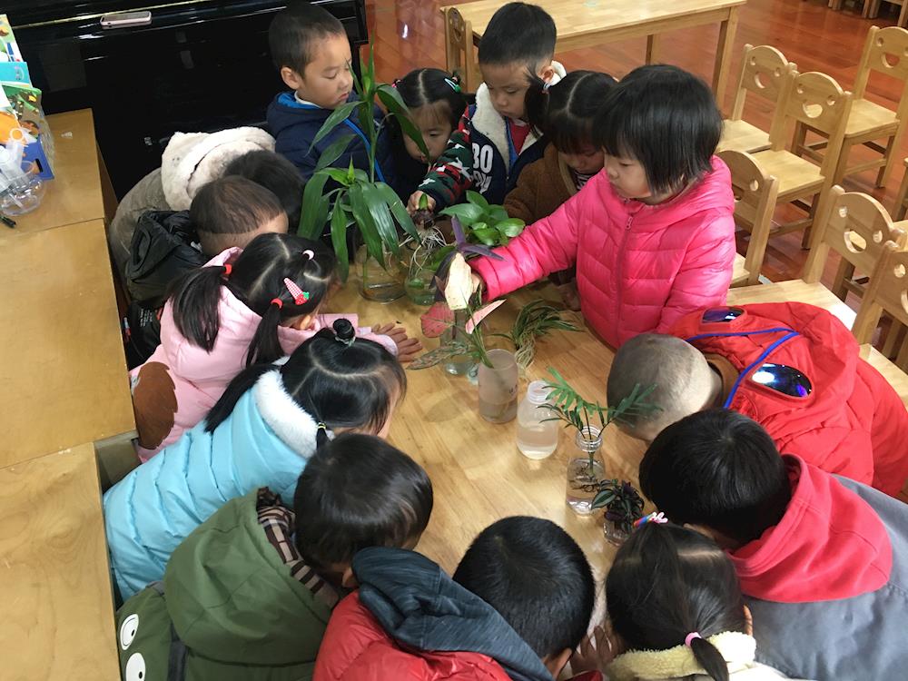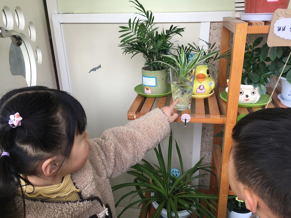 一天早上来园时,孩子们观察植物的时候,发现浸在水里的叶子黄了,他们对叶子发黄的原因很好奇,开始了自己的猜测。有小朋友说:“是不是它不能种在水里?”还有小朋友说:“可能是它的叶子浸在了水里,才黄掉的。”
