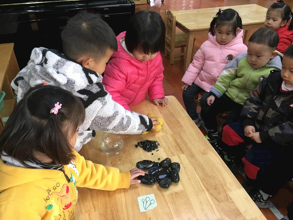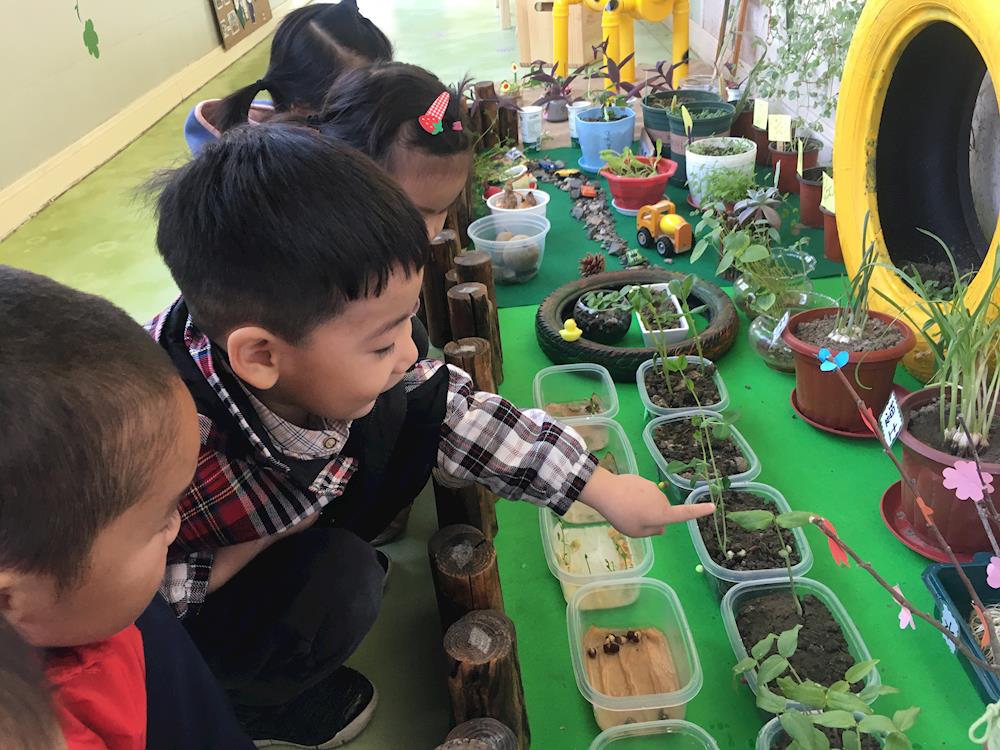 针对孩子们的猜测,我们开始了对水培植物的研究。首先孩子们和家长一起调查了适合水培的植物,并在表格中进行了记录,通过调查发现吊兰是可以种在水里的,但是叶子时不可以浸在水里的,不然很容易发黄腐烂。调查时,孩子们还了解了很多适合水培的植物。于是,我们开始给更多的水培植物找新的家。孩子们观察植物的大小和瓶子的特点,给植物们找适合的家,尽量不让植物的叶子浸在水里。孩子们经常观察植物的生长情况,我们一起了解了水培植物和土培植物的不同之处。为了进一步验证这个发现,我们用5种豆豆来做对比实验,孩子们发现:同一种豆豆,种在水里先发芽,但过一段时间以后,种在土里的豆豆的叶子长得更大,这和我们之前的发现是一致的。