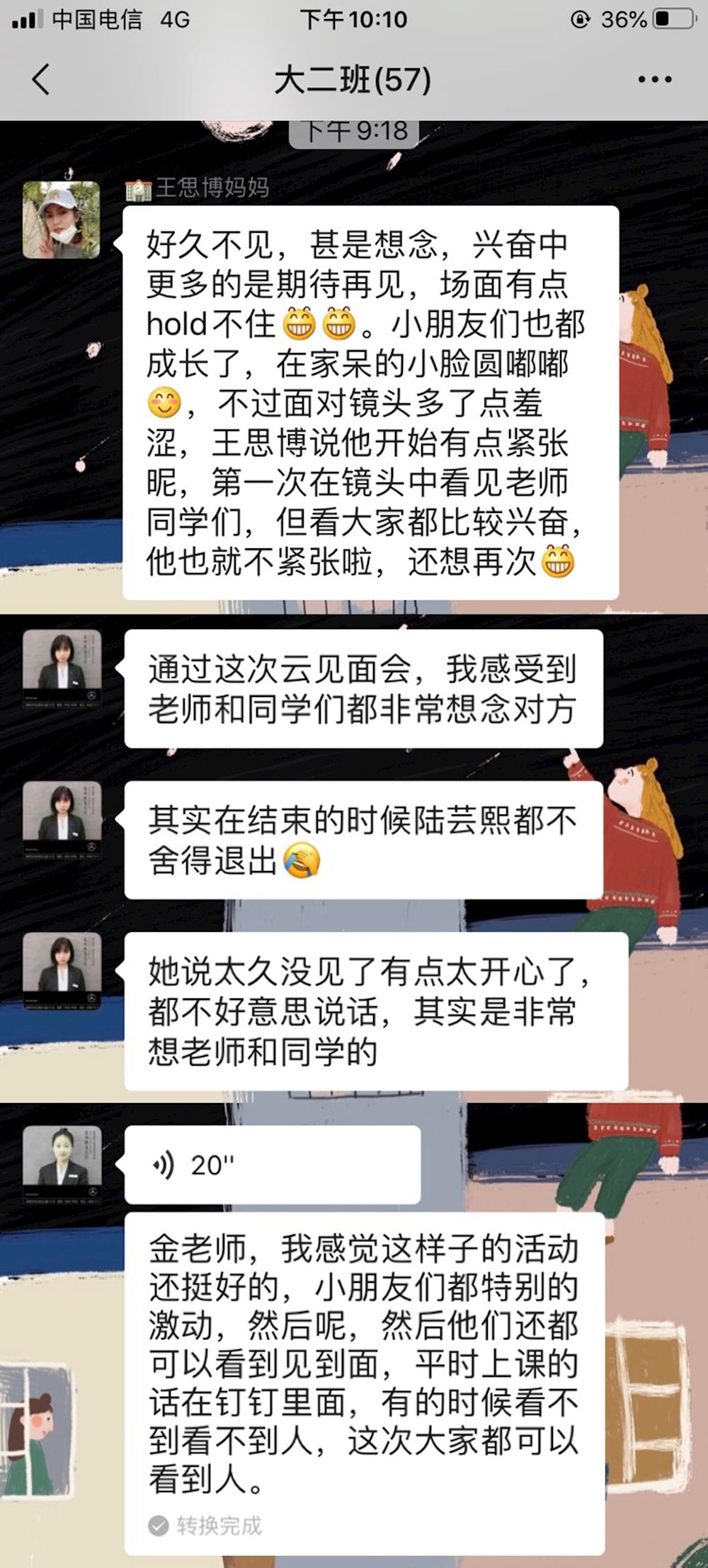 快乐的时光总是那么短暂,一个小时的时间很快就过去了,当小朋友在回味与老师、同伴见面的兴奋之情的同时,家长们也在班级群里发表了自己内心的感想。看着家长们发来的感谢,回忆起孩子们与老师依依不舍的画面,此刻的老师们也十分幸福。