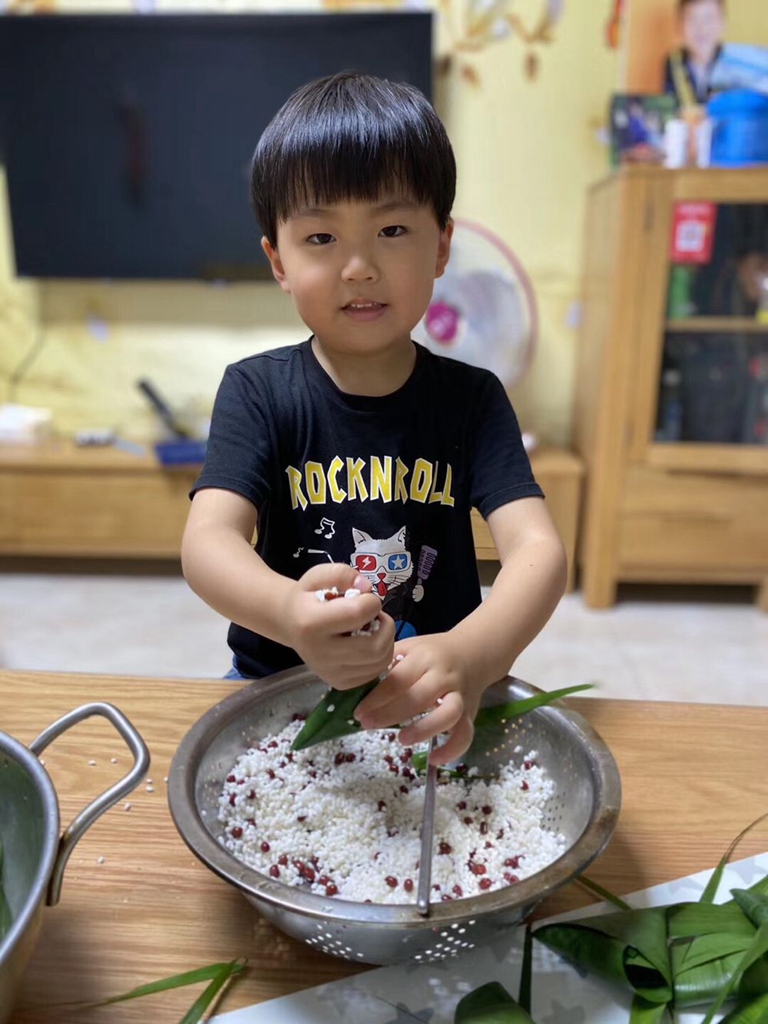 以往的端午节,有奶奶们来学校和我们一起包粽子,但受疫情的影响,今年的端午节孩子们只能在家包粽子了。孩子们尝试着舀米、加蛋黄,成为家人的小帮手,体验自己动手的乐趣!