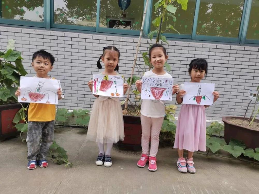 户外种植区的品种丰富多样,孩子们和老师一起给每种植物设计了名片,扫一扫上面的二维码,就能了解植物的更多奥秘。在孩子、阿姨和老师的照顾下,黄瓜、苦瓜、茄子、番茄、豇豆等蔬菜长势良好。提子成熟了,向日葵开花了,孩子们最喜欢在户外种植区进行写生,在记录植物生长的过程中,孩子们养成了爱观察的习惯。