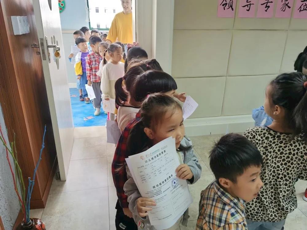 在检测的一开始,老师组织幼儿有秩序的排成一列,先是仪器检测,接着是视力表,最后是医用手电筒检测。
