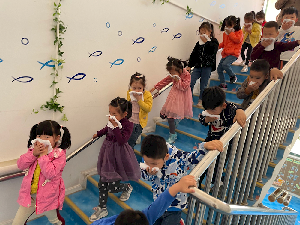 演练开始了,听到第一声警报,孩子们快速地拿好打湿的毛巾排好队。听到第二声警报,孩子们用湿毛巾捂住口鼻,弯腰低头,按照预定的疏散路线,有序撤离到操场。老师迅速地清点各班人数,并向园长汇报。整个演练过程井然有序。最后,朱园长对这次消防演练活动做了总结。她肯定了孩子们在这次演练中的疏散逃生能力,在和孩子们的互动中,进一步普及了消防安全知识。